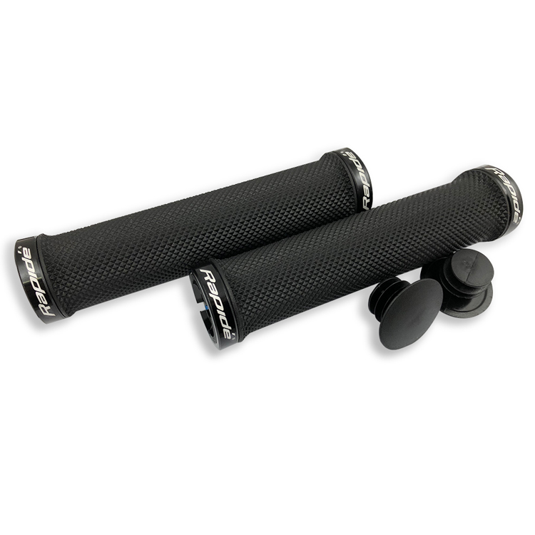 Rapidé Isolator lock on grips with dual alloy clamps and end plugs for a secure hold. Dual density lightweight synthetic rubber grip material for comfort, control and long life.